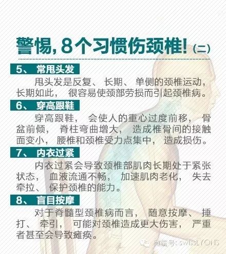 据调查, 70%-80%的人,一生中或多或少会出现颈椎问题。颈椎病的发病年龄从40岁提前到30岁,成为白领职业病。“电脑颈”成了上班族健康杀手。颈椎病的危害可不只是脖子痛那么简单,严重时可导致瘫痪!爱护颈椎,提早预防,及时治疗。为健康转发!