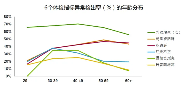 随着年龄增加,检出异常的体检指标个数增多,这不难理解,年岁大,健康问题普遍增多。但乳腺增生(女)/超重或肥胖/脂肪肝/屈光不正/慢性宫颈炎/转氨酶升高,这6大指标异常检出率在30~59岁的企业家群体里最高,呈现出明显的“中年危机”现象 。