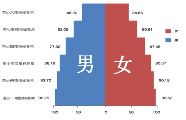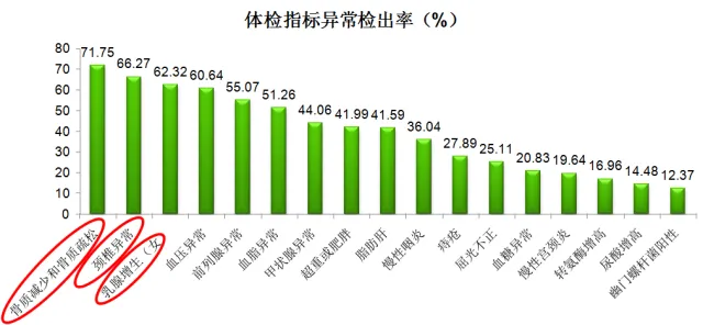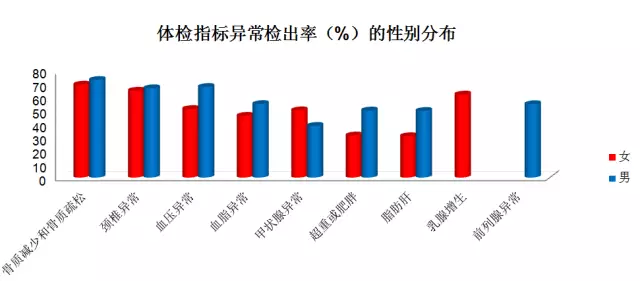 97.5%的企业家至少有一项体检指标异常,接近六成企业家有5项以上指标异常。骨质减少或疏松/颈椎病/高血压高血脂/甲状腺异常/超重肥胖/脂肪肝 ,是企业家群体高发的健康问题。半数以上女企业家患乳腺增生,半数以上男企业家患前列腺疾病。