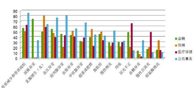 从体检指标异常检出率来看,公共服务行业的企业家在7个指标的异常检出率最高:骨质疏松/减少、高血压、高血脂、甲状腺疾病、慢性咽炎、痔疮、前列腺疾病。 备注:公共服务行业的企业家指的是:政府机关/事业单位/非盈利机构的高阶管理人员。