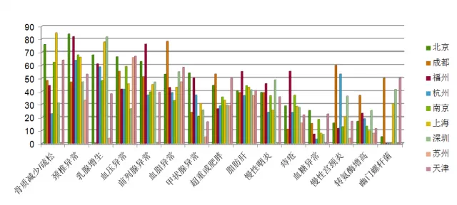 北京企业家最易出现的前几大健康问题:颈椎病、骨质减少或疏松、高血压、高血脂;上海企业家与北京的情况相似。企业家群体相对检出较高的疾病:北京-甲状腺疾病、成都-幽门螺杆菌、福州-脂肪肝/痔疮、深圳女性-乳腺增生、北京男性-前列腺疾病。